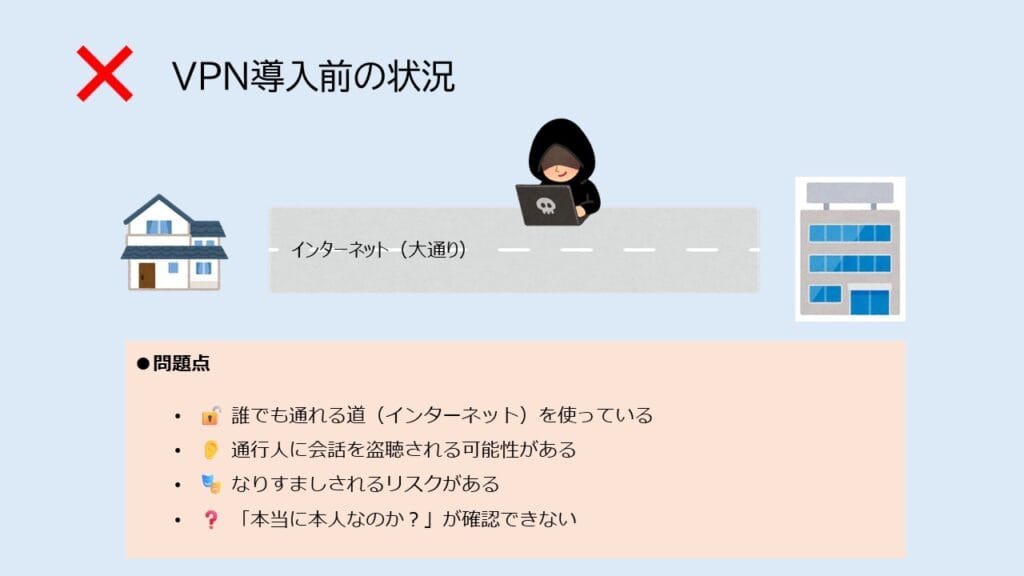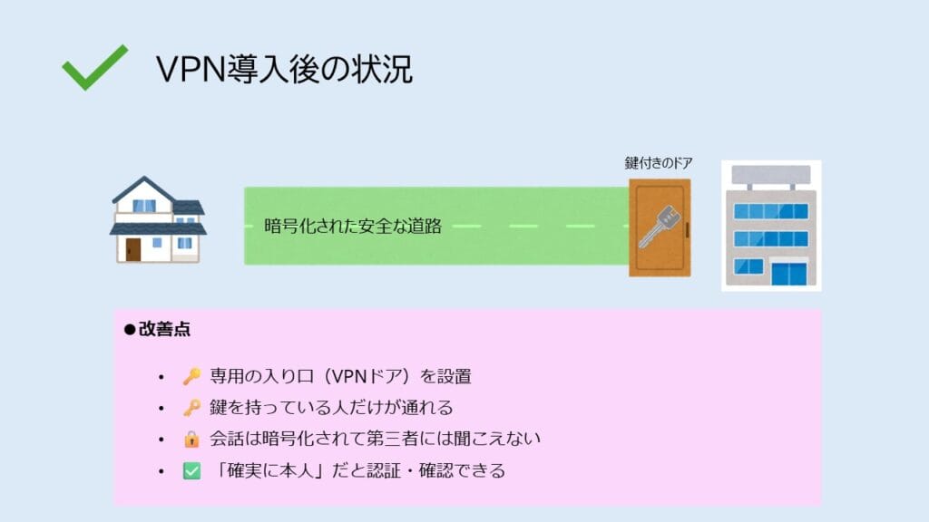 この説明をすると、営業の佐藤さん(仮名)は「あ、なるほど。家の鍵と同じね」と反応してくれました。「普通の家でも、玄関に鍵がないと誰でも入れちゃうけど、鍵があるから安心でしょ?VPNもそれと同じ」と言うと、すぐに理解してくれました。