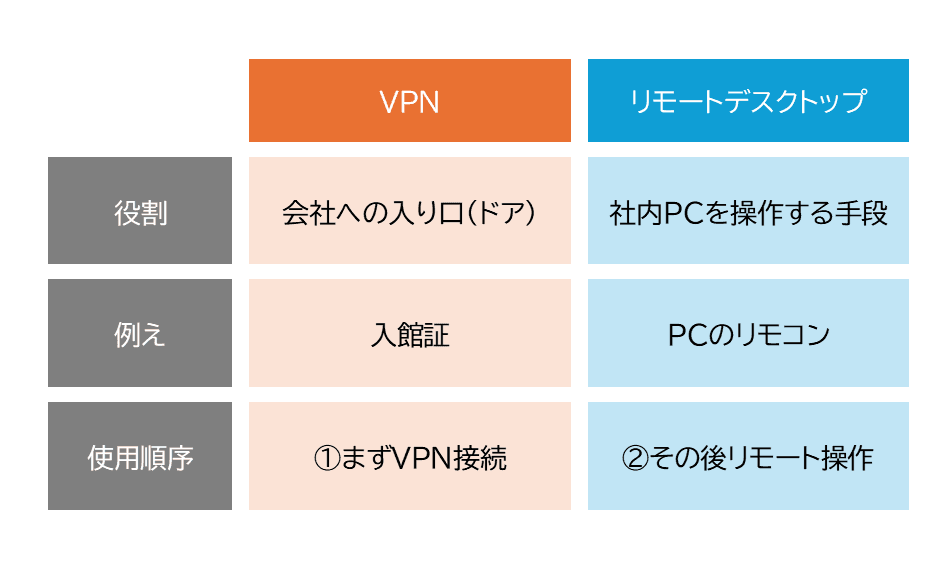 - 「VPNはドア。リモートデスクトップはその先の社内PCを操作する方法。」
